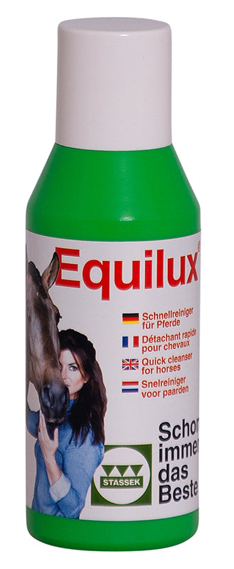 Das Pferd braucht nicht vorgewaschen zu werden. EQUILUX ist gebrauchsfertig. Es wird abschnittsweise auf das trockene, grob vorgereinigte Fell aufgesprüht oder mit einem Schwamm aufgetragen. Dann kurz mit einem saugfähigen Tuch oder Küchenpapier nachreiben. Besonders hartnäckige Flecken können ein zweites Mal behandelt werden. Nach dem Trocknen nochmals mit einer Wurzelbürste kurz überbürsten und der Fleck ist verschwunden. Die Reinigung von Mähne und Schweif erfolgt in gleicher Art und Weise.