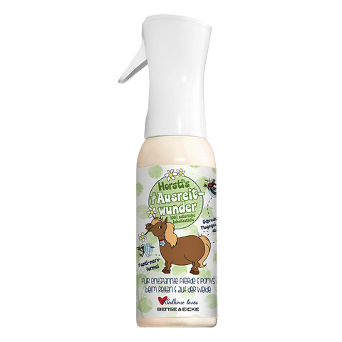 Es riecht ein wenig nach Freiheit und Lagerfeuer, dazu muss man sagen es ist gar nicht so teuer. Und pflegen tut es das Ponyfell noch dazu – Horst hat‘s getestet und wiehert „Juhu“! Im Stall und auf der Weide hält das Spray ‘ne ganze Weile. Endlich haben die Ponys ihre Ruh´ – so wird der Weidegang ‘ne Wellnesstour. Schwitzt dein Pony und strengt sich an, dann hält das Spray nicht ganz so lang. Immer dran denken, keine Stelle am Pferdekörper beim Einsprühen verschenken!