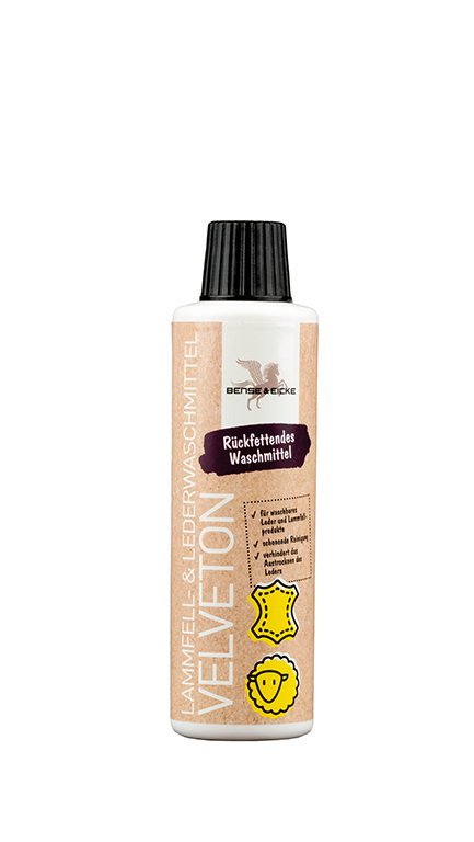 Enthält neben den reinigenden, weitgehend natürlichen Rohstoffen auch rückfettende Substanzen, die ein Austrocknen und Verhärten des Leders verhindern. Velveton ist u.a. besonders geeignet für Lammfellprodukte, waschbares Leder, lederbesetzte Kleidung, Reithosen, Lederhandschuhe und Lederbekleidung.